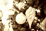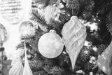 Elegant close-up of a Christmas tree adorned with beautiful white and silver spiral and frosted bauble ornaments, intertwined with festive lights, creating a serene and wintry holiday atmosphere.