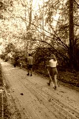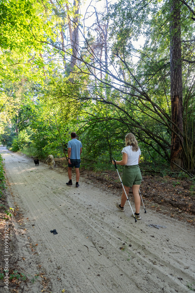 Couple and their dogs enjoy a refreshing walk on a sunny forest path. The woman uses walking poles, highlighting an active, healthy lifestyle amidst lush green nature. Perfect for outdoor recreation,