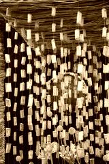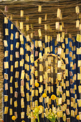 Natural decor featuring a screen of hanging dried plant pieces against a dark background, accented with delicate yellow and white flowers. Perfect for rustic, eco-friendly, or craft-themed designs.