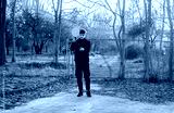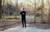 Young man playing paddleball outdoors in a park during a sunny autumn day, dressed in casual sportswear. Active lifestyle and recreation.