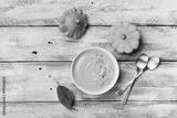 Fresh pumpkin soup decorated seeds and thyme in white bowl on rustic wooden table top view. Cozy lifestyle shot for autumn halloween menu.