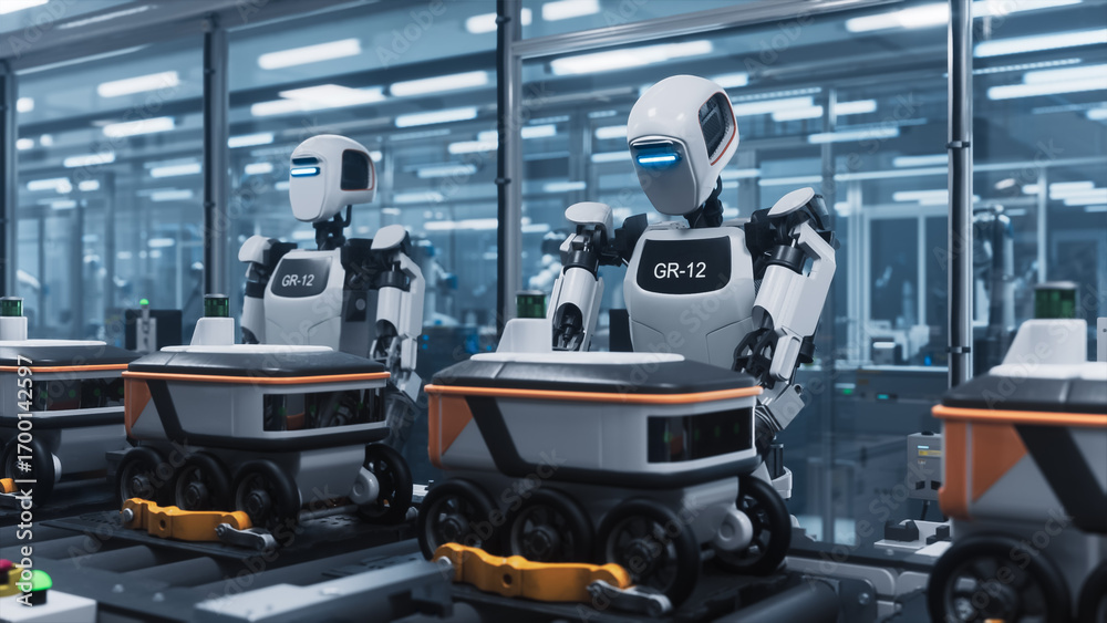 Advanced Humanoid Robots Connect Mechanical Components on a Conveyor Belt, Assembling Intelligent Delivery Devices. Fully Autonomous Unmanned Manufacturing System Powered by Artificial Intelligence
