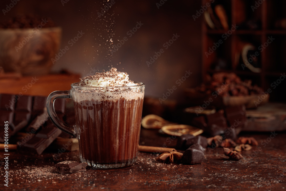 Hot chocolate topped with whipped cream and sprinkled with chocolate chips.