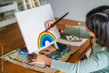 Female kid painting a rainbow at home - Education, art and creativity for children concept - Main focus on right hand