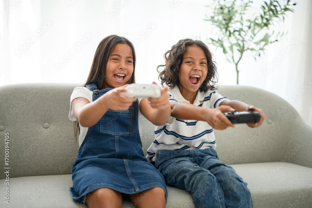 two 9 years thailand twin sit on sofa at home play video game