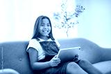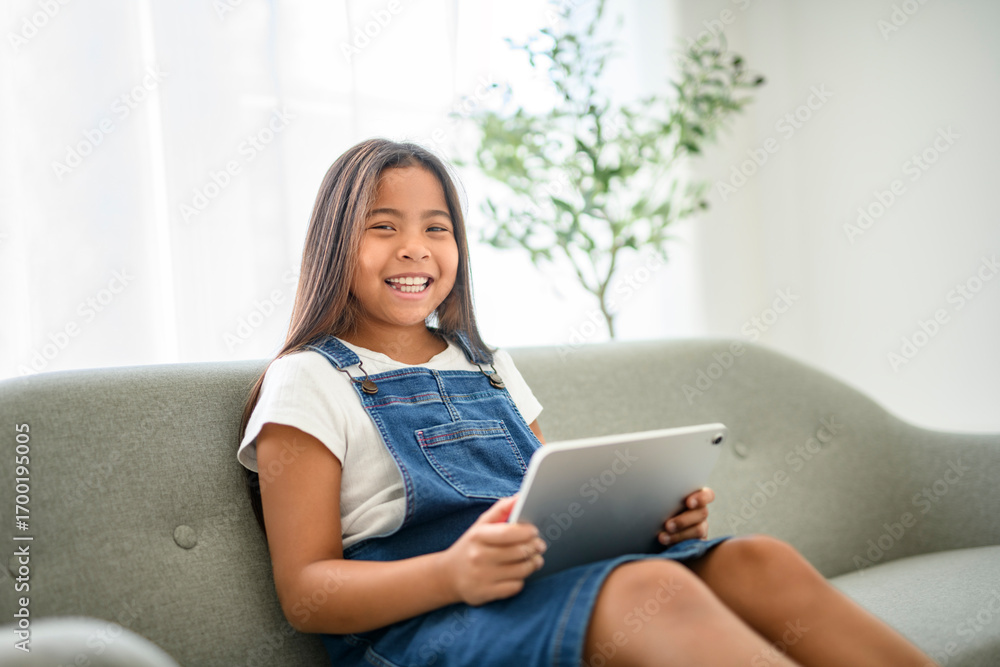 9 years thailand girl sit on sofa at home with tablet