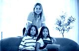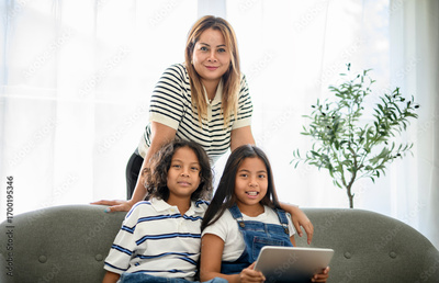 two 9 years thailand twin sit on sofa at home with tablet and mother