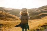 A female traveler with a backpack and a hat enjoys the mountain landscape at sunset. A tourist walks along a rocky path on a sunny day, feeling free. The idea of travel, freedom. Active lifestyle.