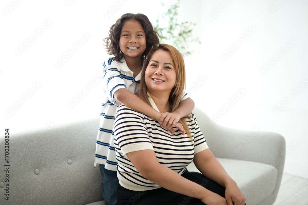 9 years thailand boy having great time on sofa with his mother