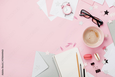 Cup of coffee, macaron, alarm clock, office supply and clean notebook on pink pastel table top view. Flat lay. Beautiful morning breakfast. Fashion woman blogger working desk.