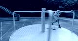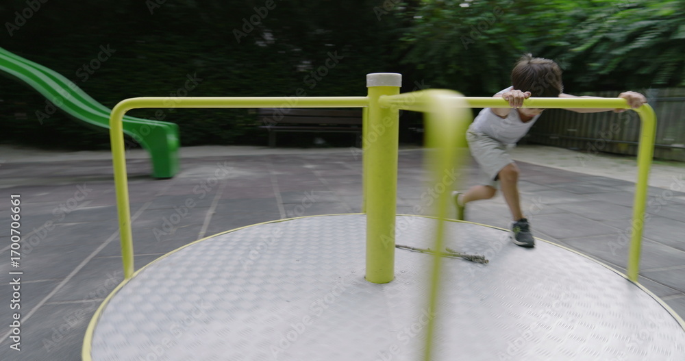 Boy spinning on a playground carousel, surrounded by green trees and a wooden fence in a serene park setting