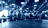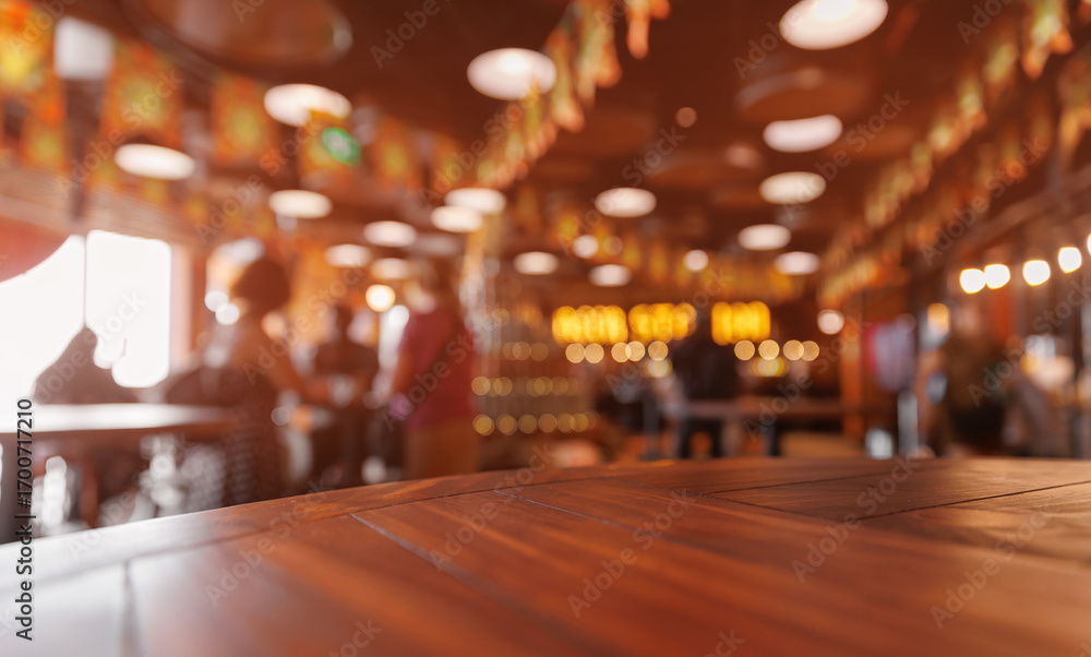 Blurred background warm rustic wooden tabletop of bar interior, sunlight