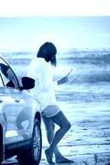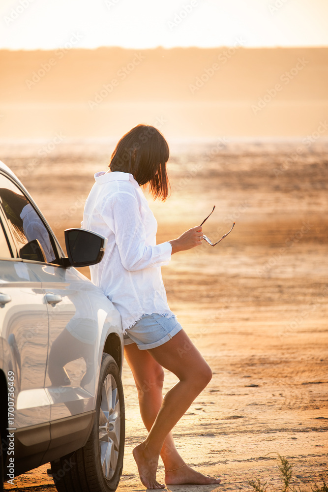 Woman in white shirt and shorts leaning on car at sunset, holding sunglasses. Concept of summer travel, freedom, roadtrip lifestyle, relaxation, and adventure.