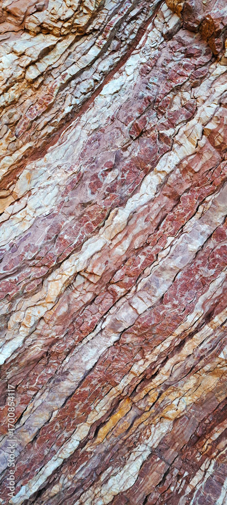 Close-up view of layered rock formations showing rich textures and natural striations in red, orange, and white tones, highlighting geological patterns and rugged surface details.