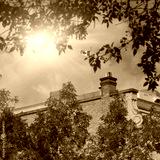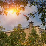 Street level view of a brick building in downtown Saskatoon, Canada, with a Canadian flag on the rooftop and autumn leaves in the foreground under a partly cloudy sky.