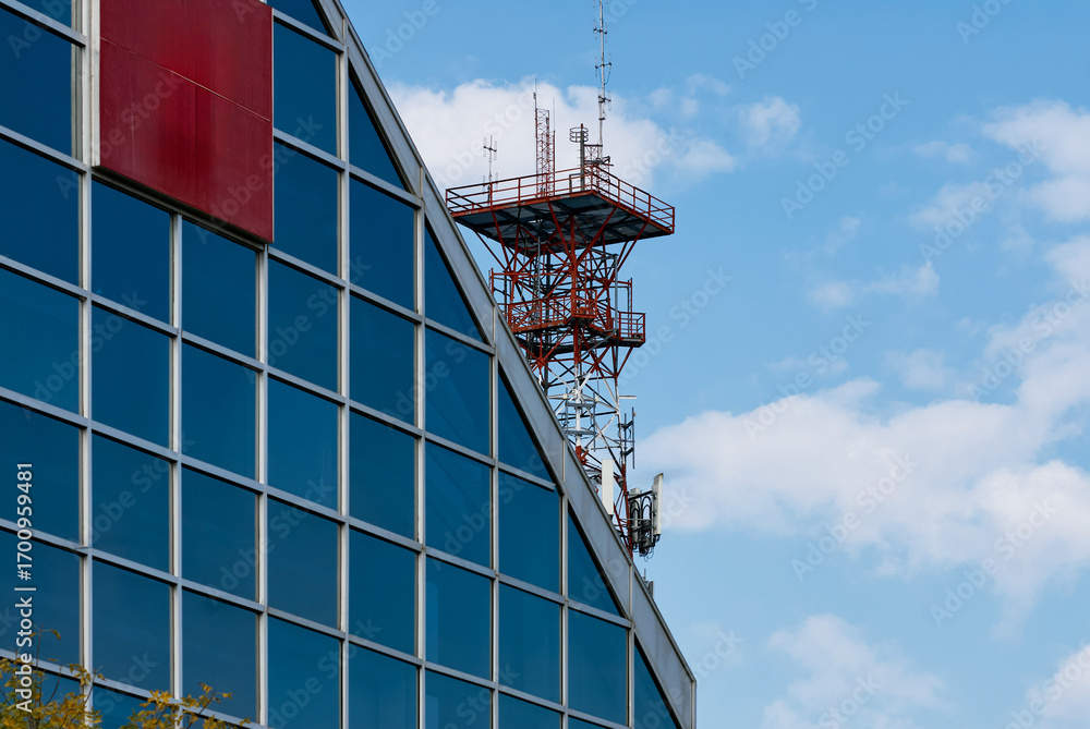 Low angle view of a modern skyscraper in downtown Saskatoon, Canada, featuring white facade with vertical glass windows and geometric design under a clear blue sky.