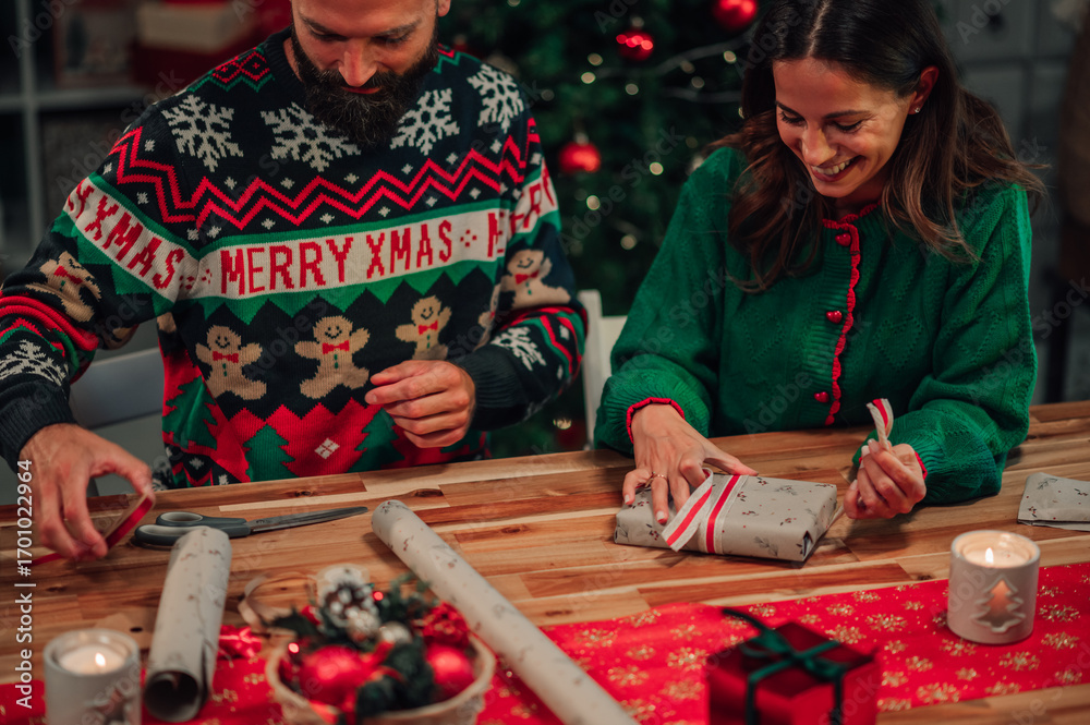 Couple wrapping christmas presents at home