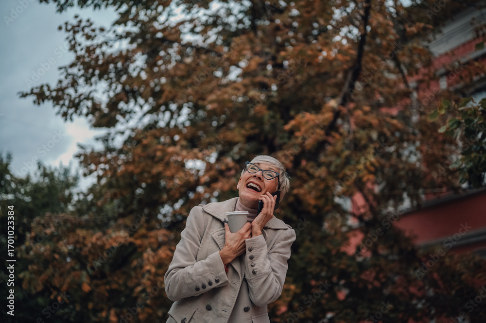 Senior woman laughing while talking on phone and holding coffee in autumn city