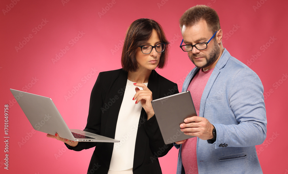 businessman and businesswoman looking at tablet consulting deciding. man and woman in business clothes with tablet and laptop on pink background