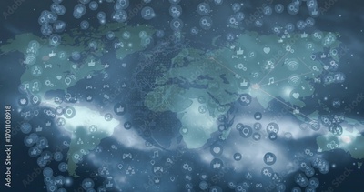 Floating world map over dark blue backdrop, digital icons, network lines, cloud-like light streaks