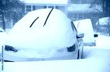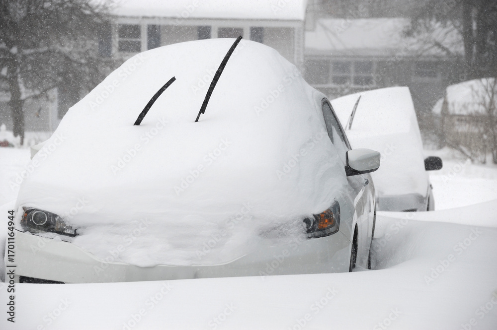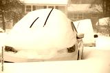 close up on snow covered car on the driveway in blizzard