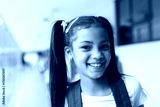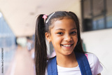 Smiling girl with backpack standing in school hallway, feeling happy and confident