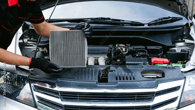 Auto mechanic holding car air conditioner filter for check and clean dirty or fix repair heat have engine problem or replace new change air filter of car care maintenance servicing concepts.
