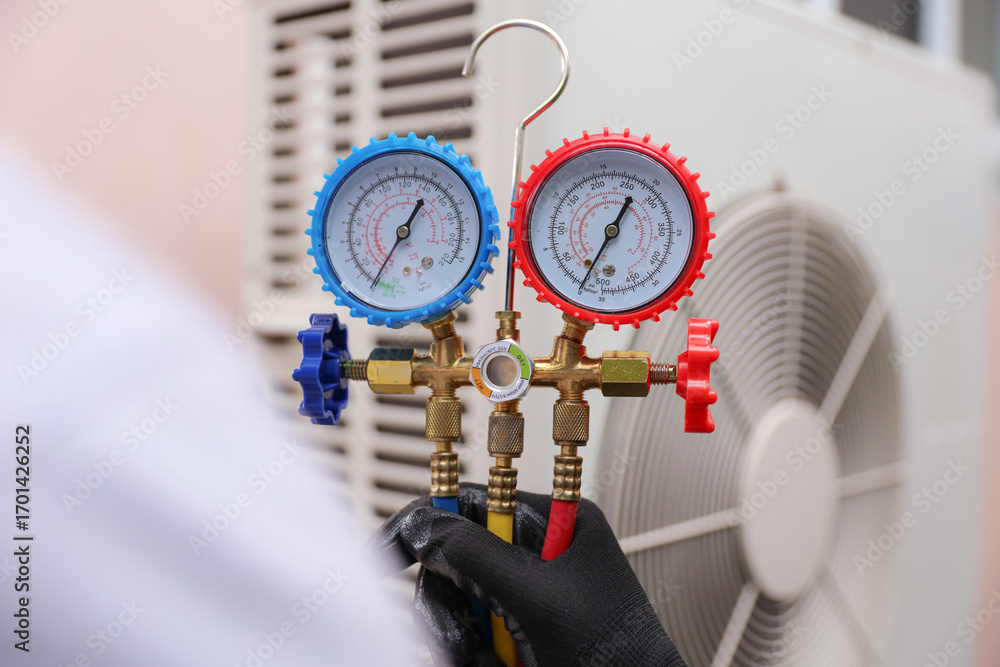 Air conditioning electrical technician using manifold gauge measuring tool checking refrigerant pump filling home air conditioner and maintenance heat fix repair and clean outdoor compressor unit.