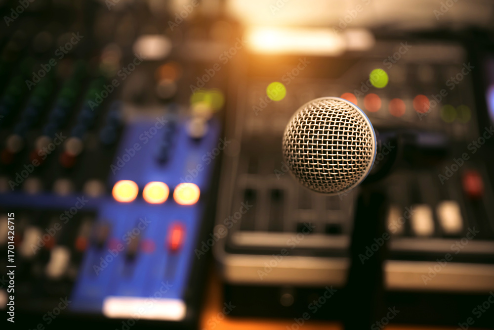 Microphone with sound mixer in studio for producer live broadcasting or audio equipment music instrument speaker of sounds record concepts.