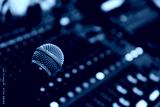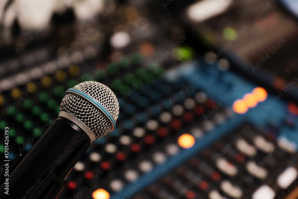 Microphone with sound mixer in studio for producer live broadcasting or audio equipment music instrument speaker of sounds record concepts.