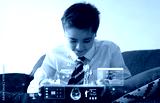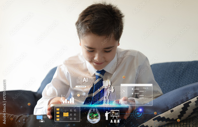 Teen boy studying with tablet and AI interface graphics.Concept of e-learning, artificial intelligence in education,online study with classmates, multilingual learning and future classroom technology