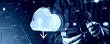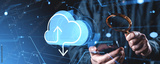Cloud storage security concept with magnifying glass, data upload and download icons, and digital interface on blue background.