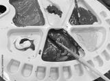 A white watercolor palette mixing plastic tray with several compartments , containing various acrylic for mixed colors such as red, yellow, blue, and green. Focus on red with a paintbrush.