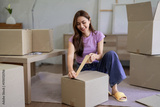 Asian Young Adult Women Sealing Boxes With Tape for Moving Relocation To New Home Apartment Organize Belongings Packing Preparation Process