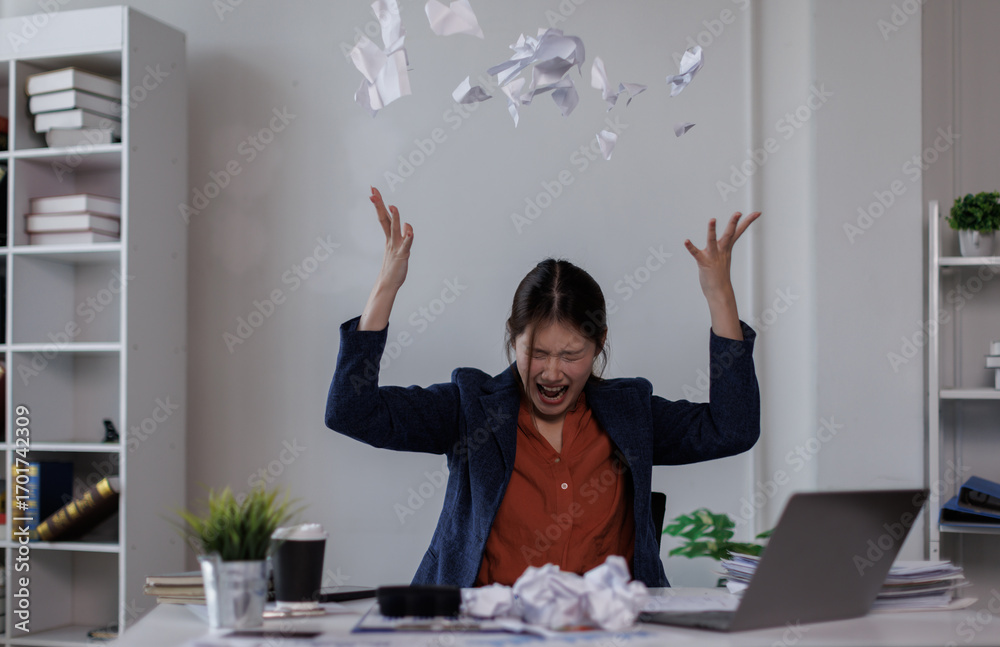 Asian woman sitting in an office With stress and eye strain Tired, portrait of sad unhappy tired frustrated disappointed lady suffering from migraine sitting at the table, Sick worker concept
