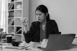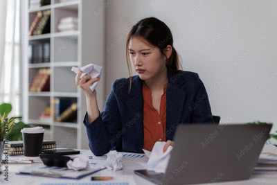 Asian business woman or female office worker screaming, shouting and throwing up papers at her office desk. Angered, furious, crazy Depression, overworked, failure.