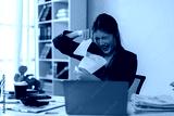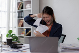 Asian business woman or female office worker screaming, shouting and throwing up papers at her office desk. Angered, furious, crazy Depression, overworked, failure.