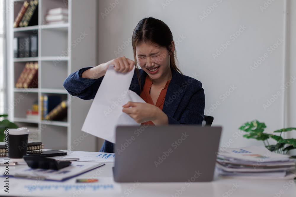 Asian business woman or female office worker screaming, shouting and throwing up papers at her office desk. Angered, furious, crazy Depression, overworked, failure.