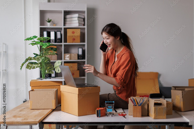 Asian woman small businesses SME owners asian female entrepreneurs call phone on receipt box and check online orders to prepare to pack the boxes, sell to customers, SME business ideas online.