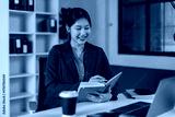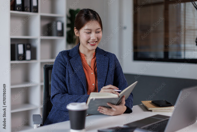 Portrait of an Asian young Female working on a laptop computer in workplace office, Asian woman happy hold notebook and pen at desk.