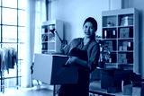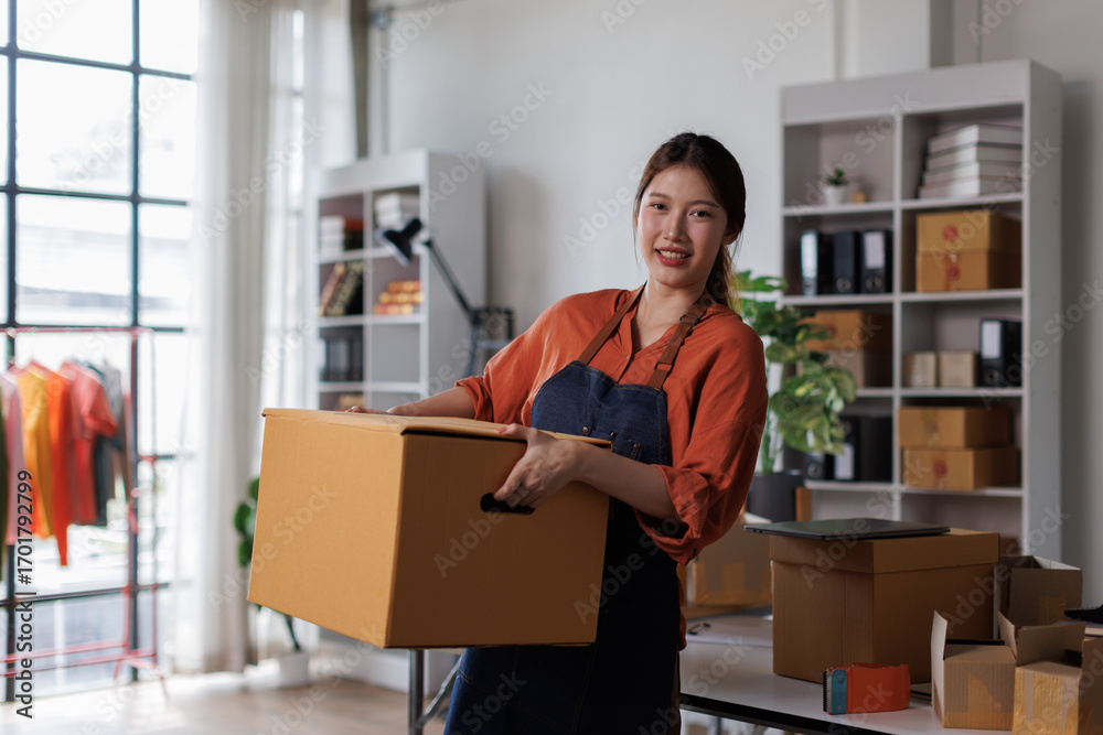 Startup SME small business entrepreneur SME of freelance Asian woman packaging box on her hand lifts up online marketing and delivery SME idea concept