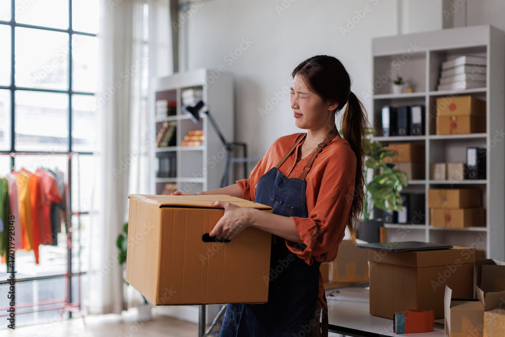 Startup SME small business entrepreneur SME of freelance Asian woman packaging box on her hand lifts up online marketing and delivery SME idea concept