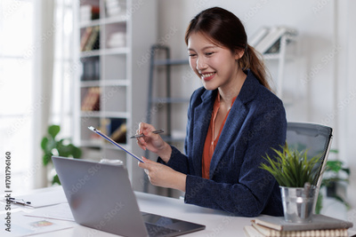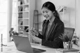 Accounting finance and taxation planning for profitable cash flow, asian woman accountant working in office, analyze financial data and accounting record with calculator.Insight