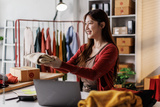 Asian woman describe selling clothes on camera live broadcast on social network at home, Online selling clothes on social media. Blogger woman influencer, SME retail store owner.