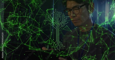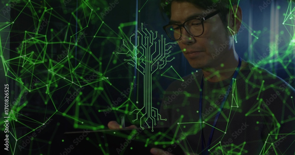 Mature Korean man wearing glasses examining tablet in dim server bay, with green network overlay