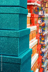 Vibrant stack of teal glitter gift boxes in focus, with a blurred background of colorful Christmas presents. Perfect for holiday sales, celebrations, and festive promotions.