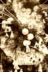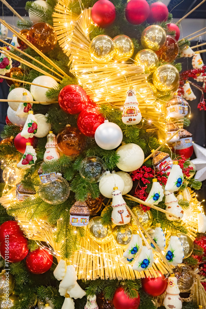 Vibrant Christmas tree adorned with traditional ornaments, glowing string lights, and festive baubles in red, gold, and white, evoking a joyful holiday spirit. Perfect for seasonal celebrations.