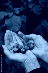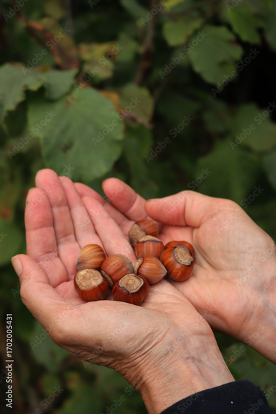 Close-up of woman farmer holding ripe hazelnuts near hazel tree plantation on late summer. Corylus avellana
