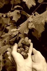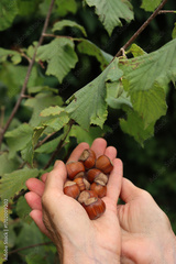 Close-up of woman farmer holding ripe hazelnuts near hazel tree plantation on late summer. Corylus avellana