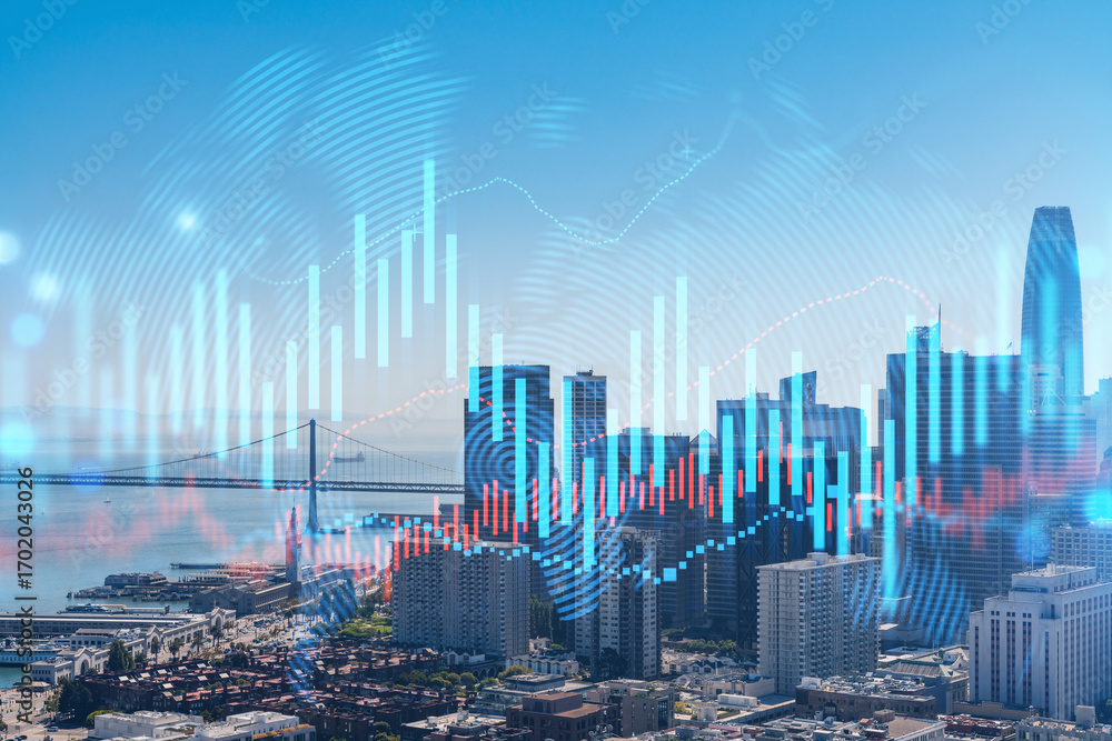 Skyscrapers Cityscape Downtown View, San Frencisco Skyline Buildings. Beautiful Real Estate. Day time. Forex Financial graph and chart hologram. Business education concept.